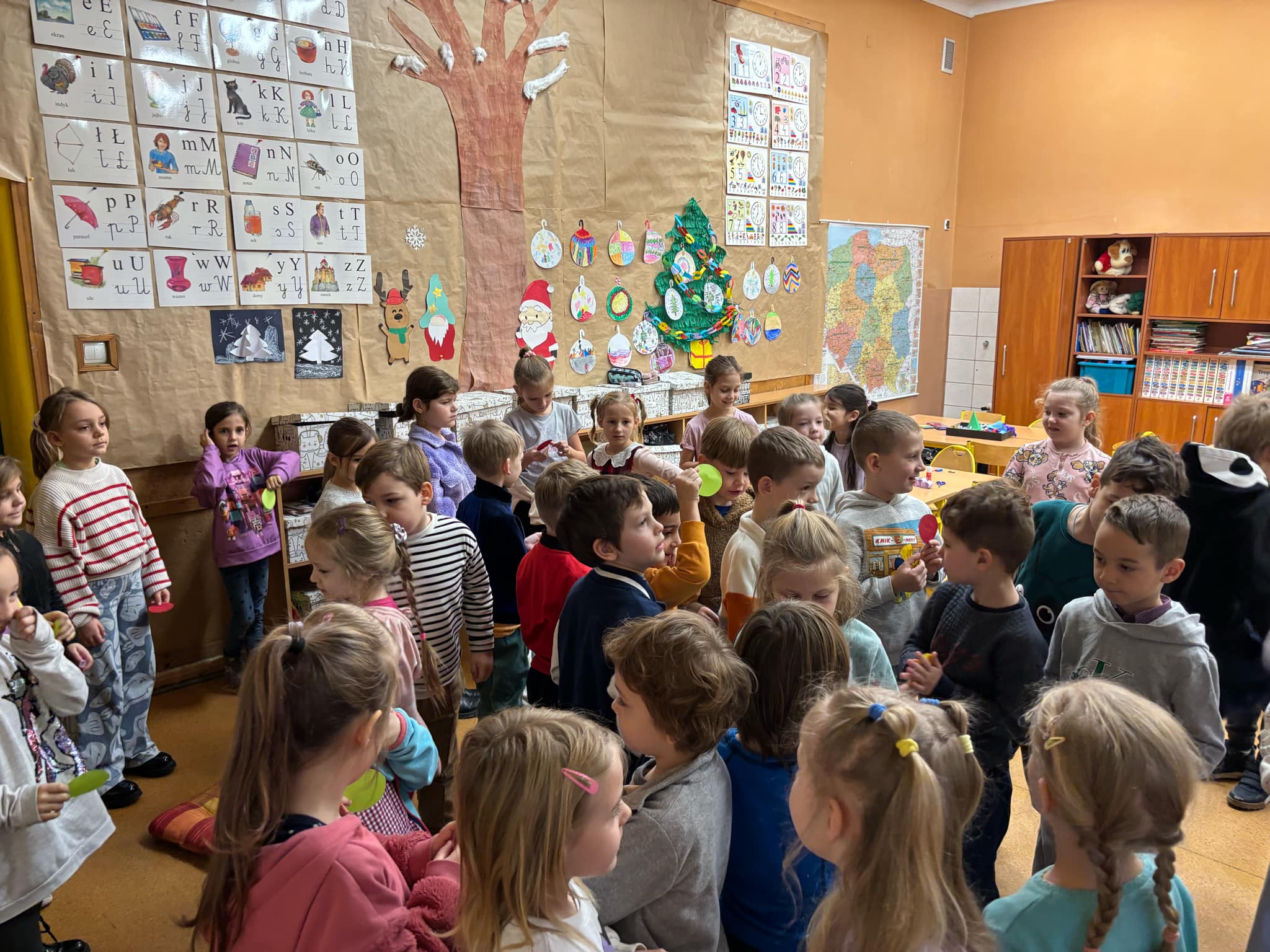 grupa "Jeży" odwiedziła klasę I w Zespole Szkolno- Przedszkolnego nr 4. Nasze przedszkolaki wzięły udział w zajęciach, których celem było zapoznanie się z jedną z tradycji Świąt Bożego Narodzenia- ubieraniem choinki