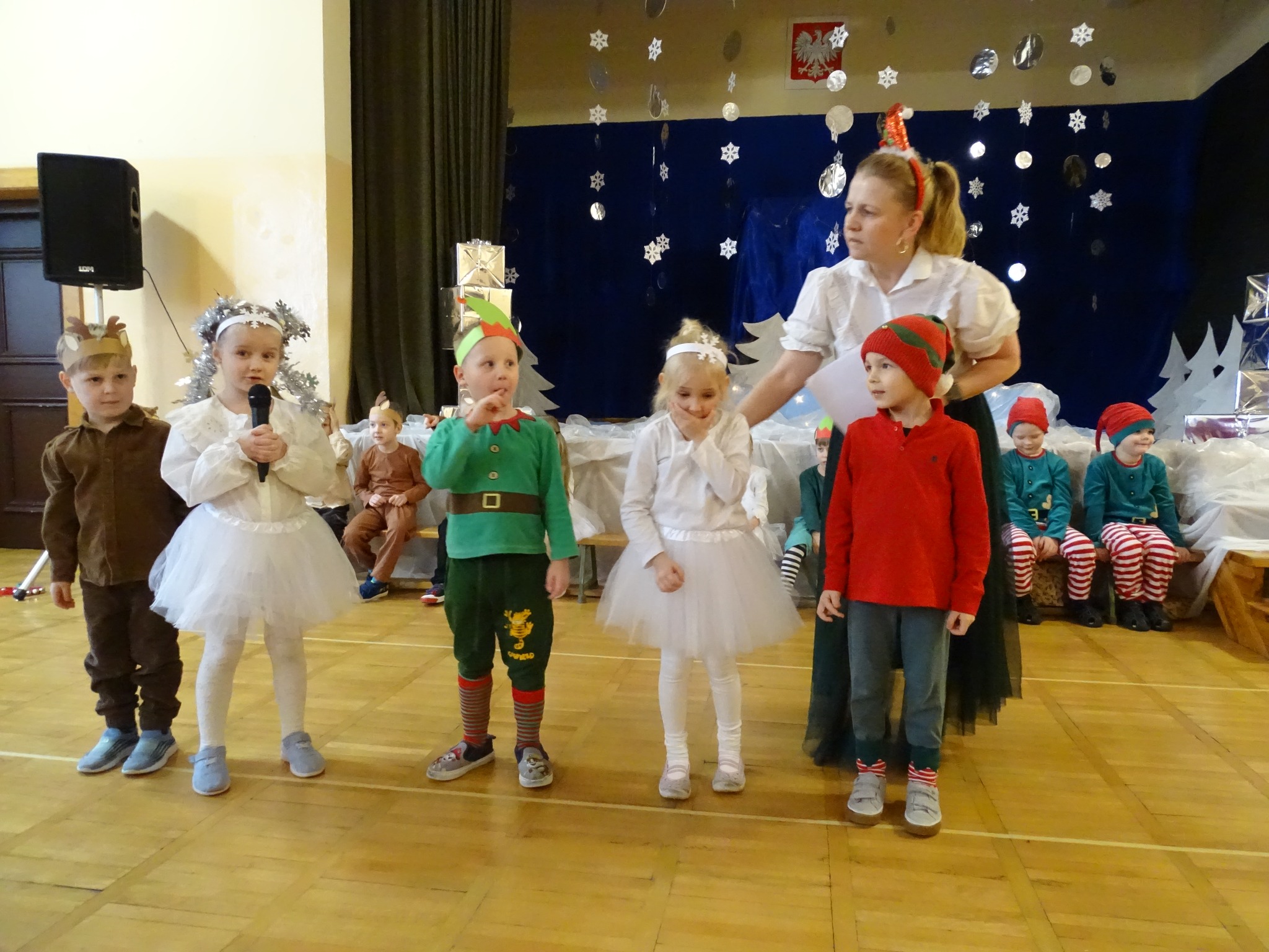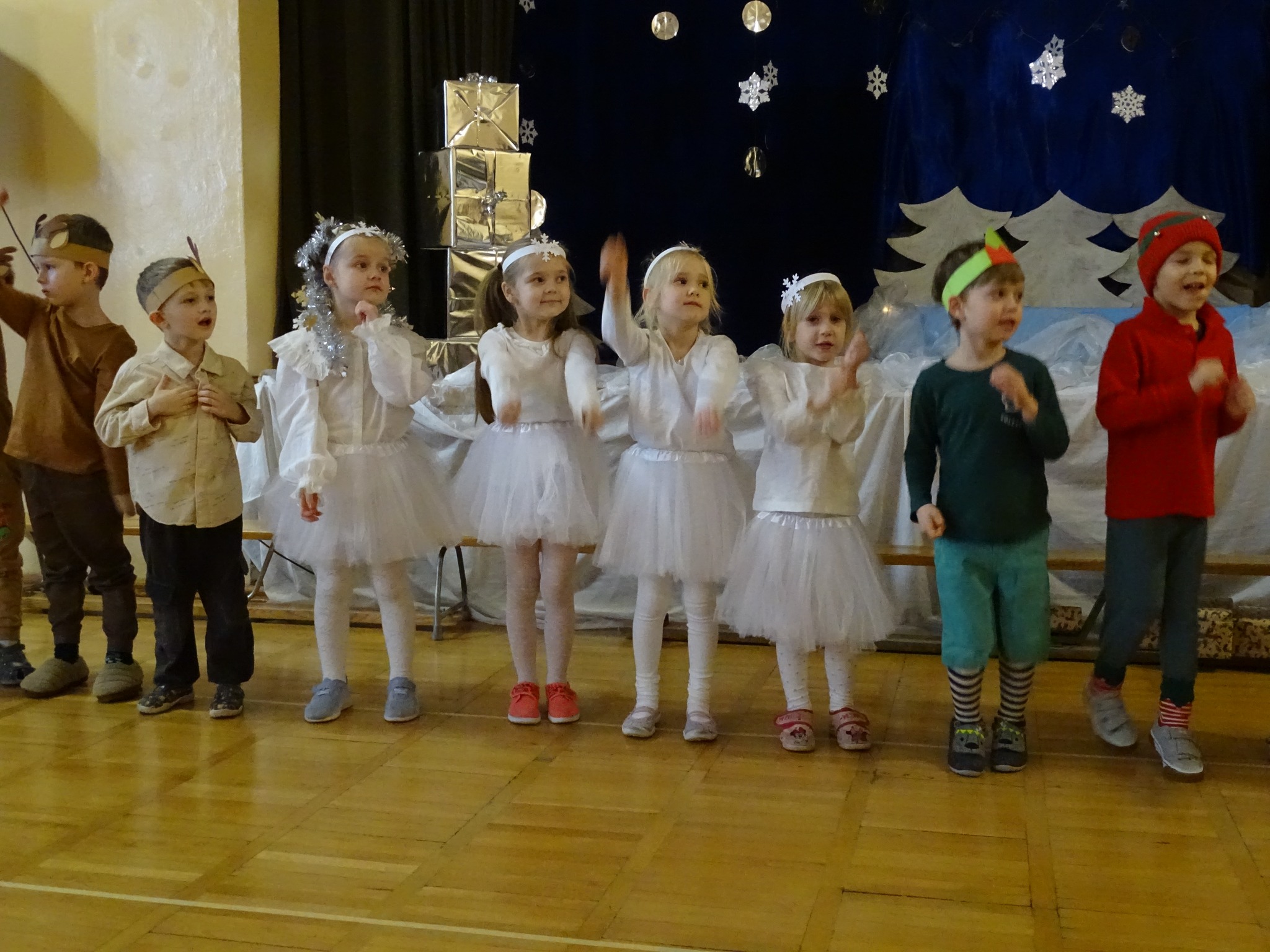 Na biegunie północnym, pośród polarnej nocy, gdzie śniegu jest po kolana żyje stado reniferów, elfów zgraja roześmiana i Mikołaj zwany świętym. Wiewiórki przeniosły zgromadzonych gości do tej pięknej krainy życząc wesołych świąt.