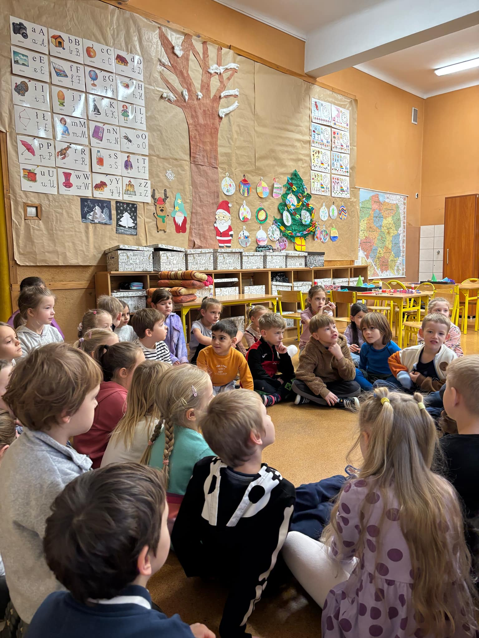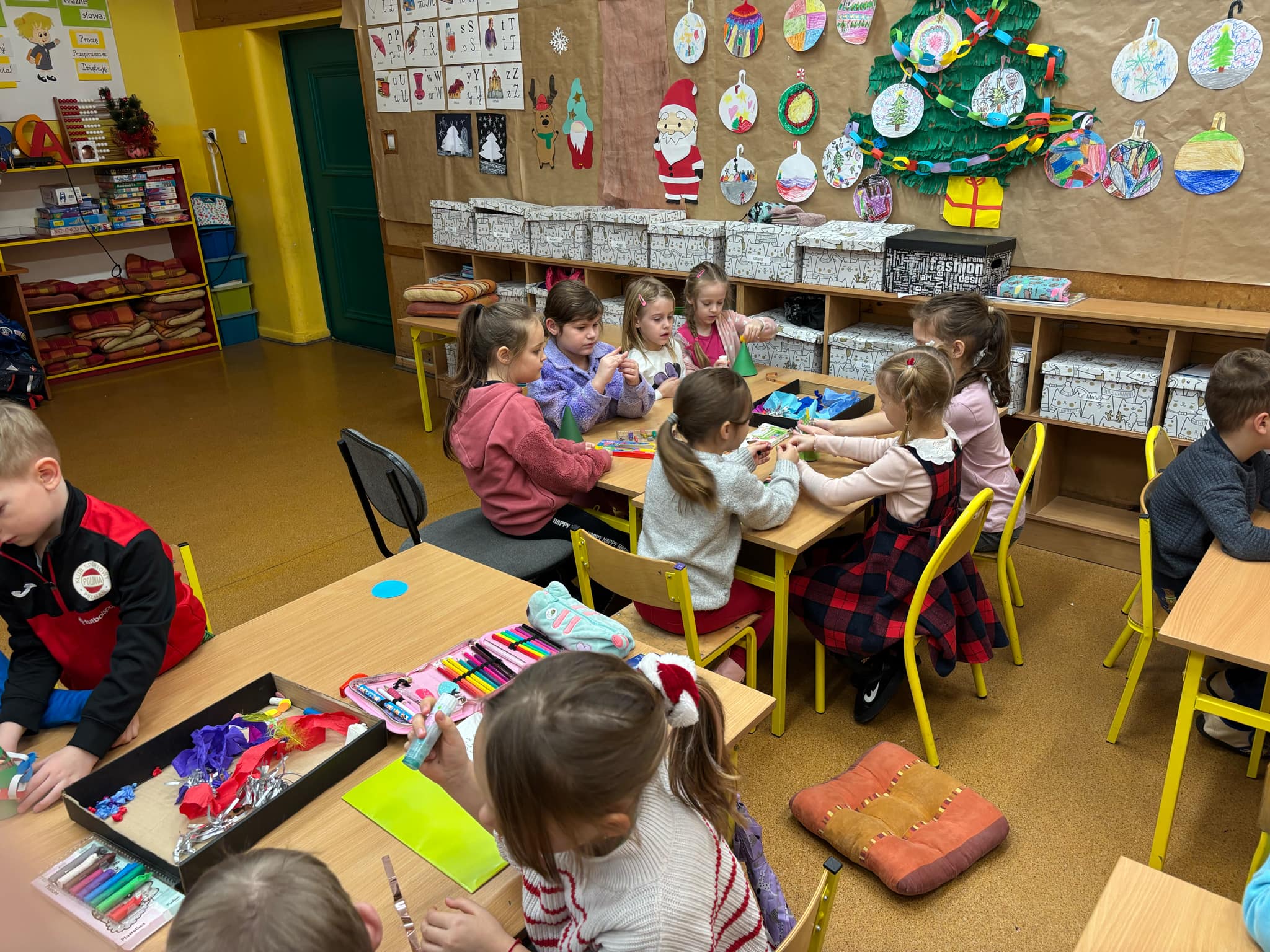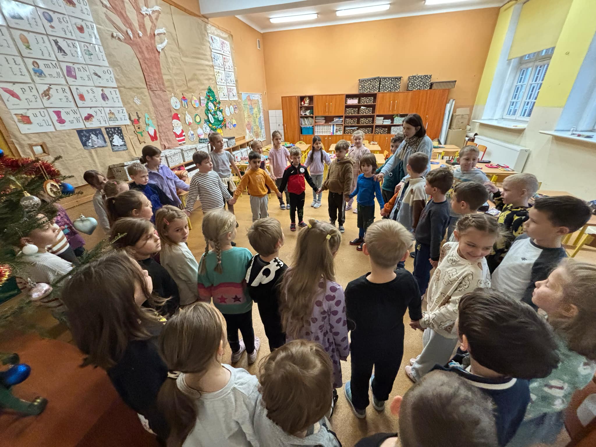 grupa "Jeży" odwiedziła klasę I w Zespole Szkolno- Przedszkolnego nr 4. Nasze przedszkolaki wzięły udział w zajęciach, których celem było zapoznanie się z jedną z tradycji Świąt Bożego Narodzenia- ubieraniem choinki