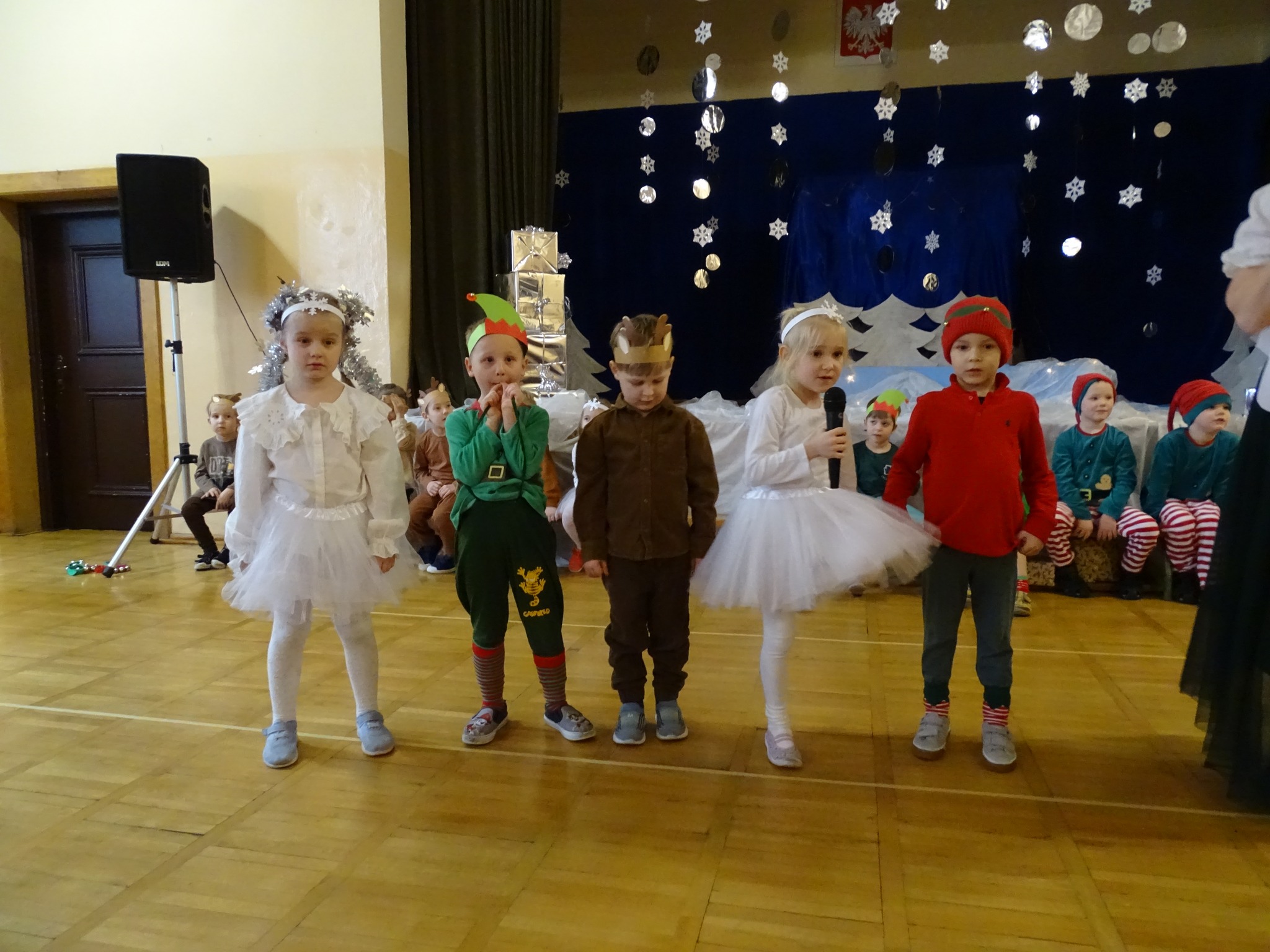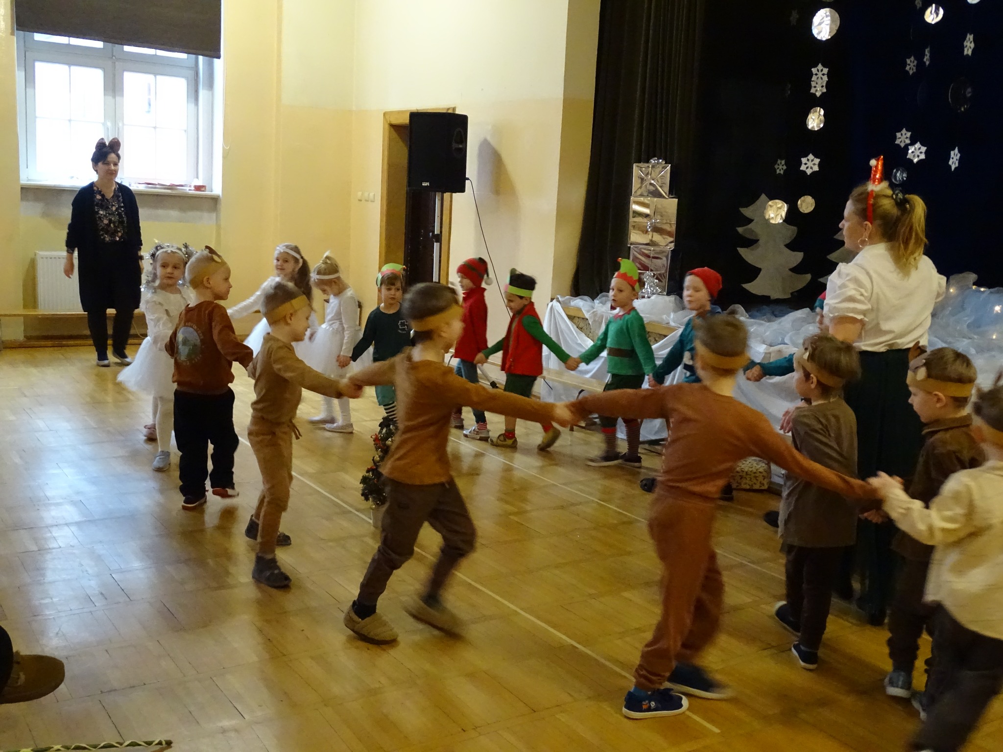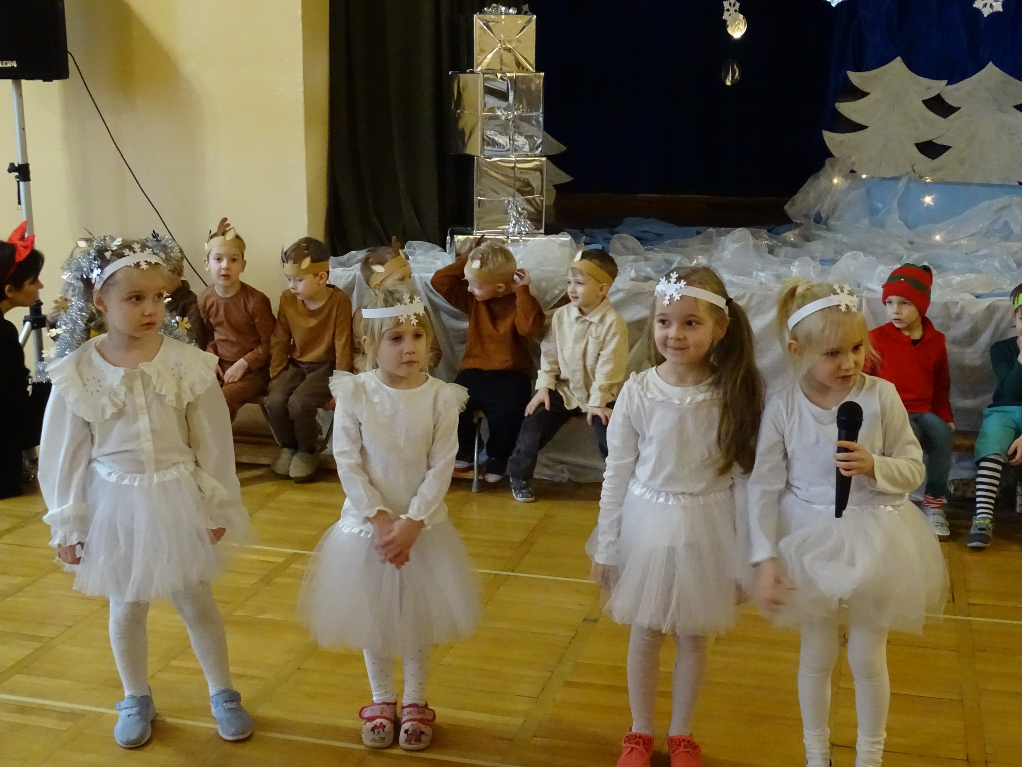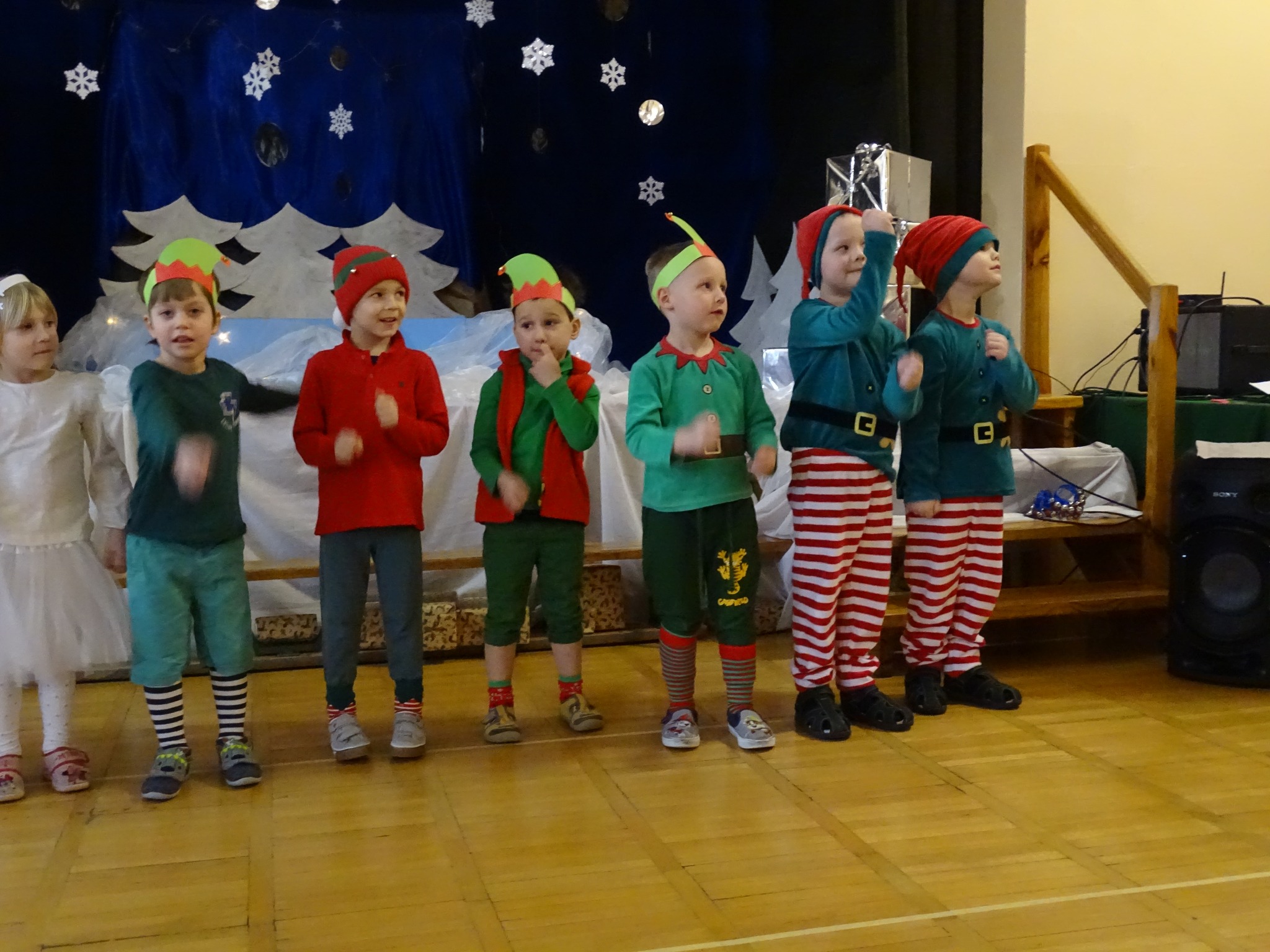 Na biegunie północnym, pośród polarnej nocy, gdzie śniegu jest po kolana żyje stado reniferów, elfów zgraja roześmiana i Mikołaj zwany świętym. Wiewiórki przeniosły zgromadzonych gości do tej pięknej krainy życząc wesołych świąt.