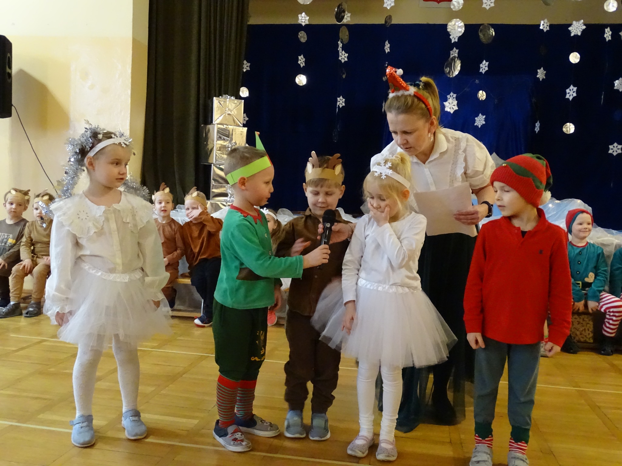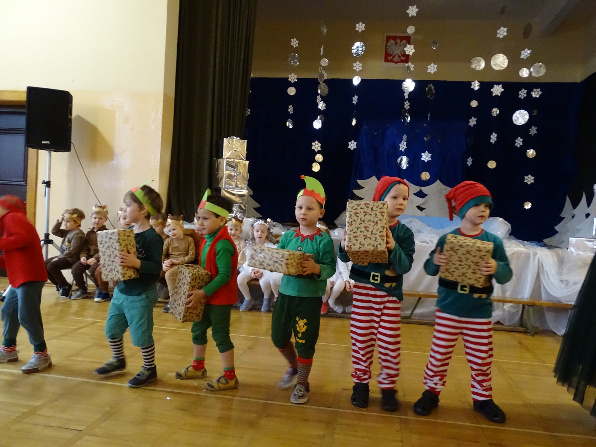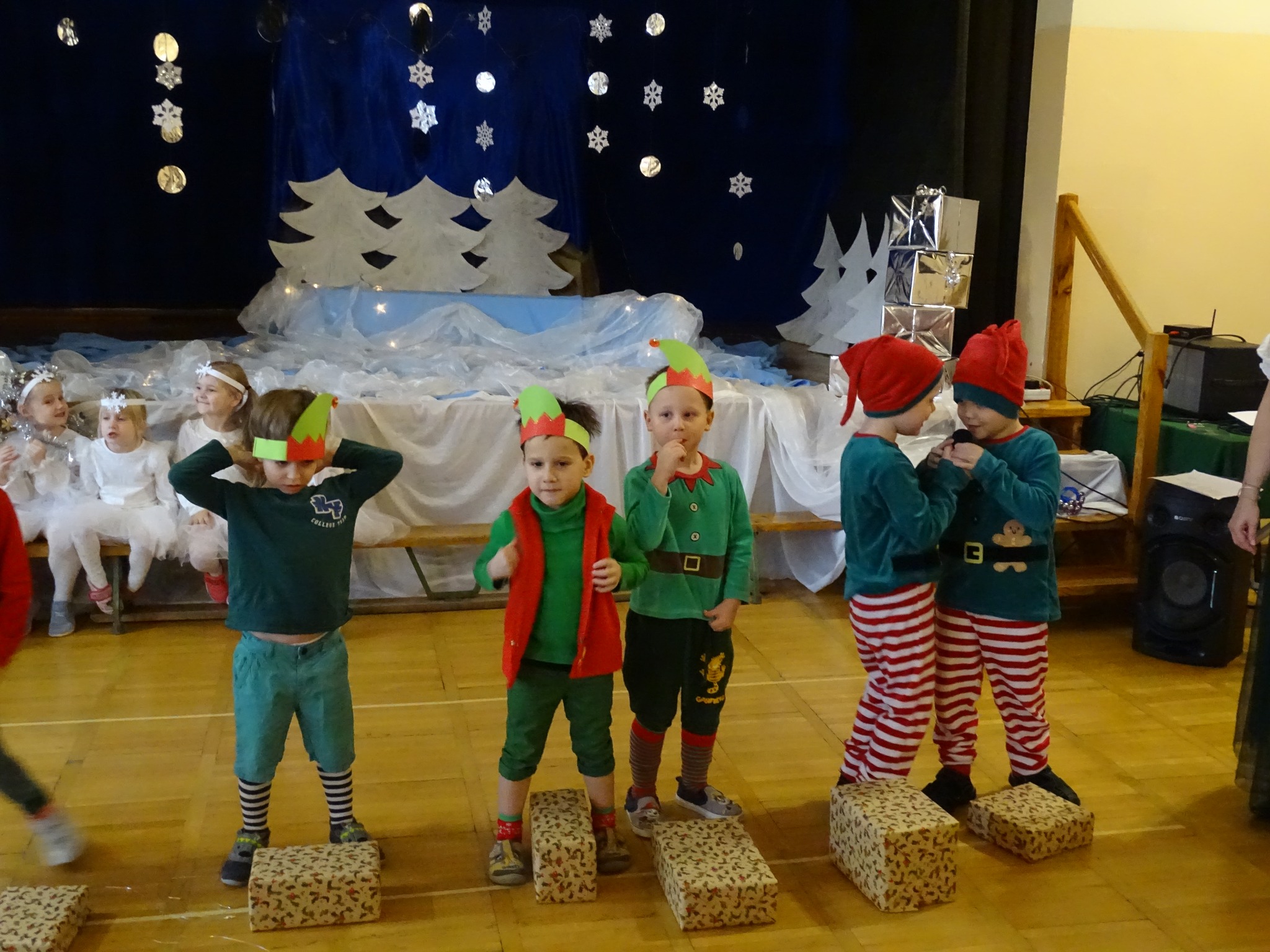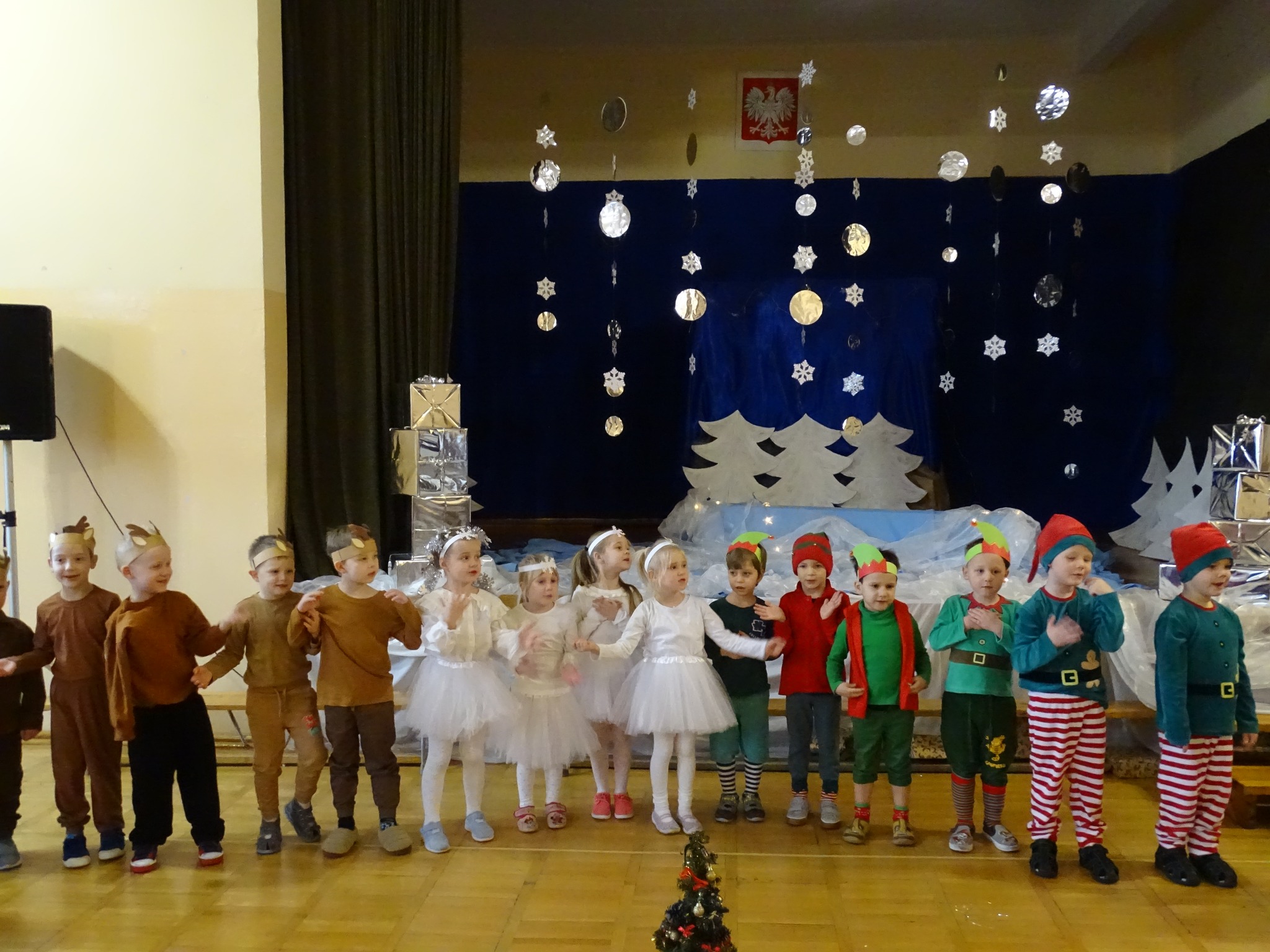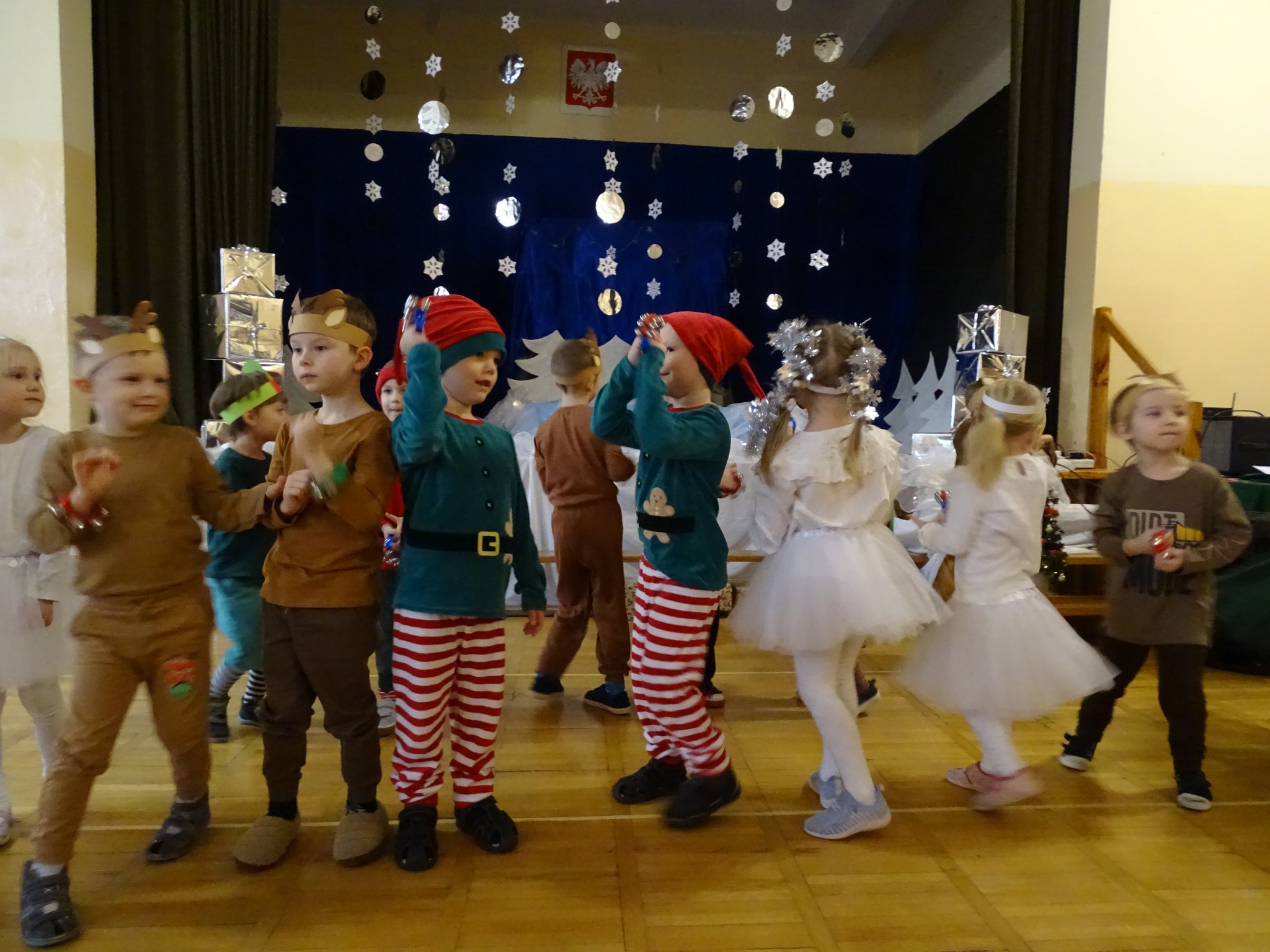 Na biegunie północnym, pośród polarnej nocy, gdzie śniegu jest po kolana żyje stado reniferów, elfów zgraja roześmiana i Mikołaj zwany świętym. Wiewiórki przeniosły zgromadzonych gości do tej pięknej krainy życząc wesołych świąt.