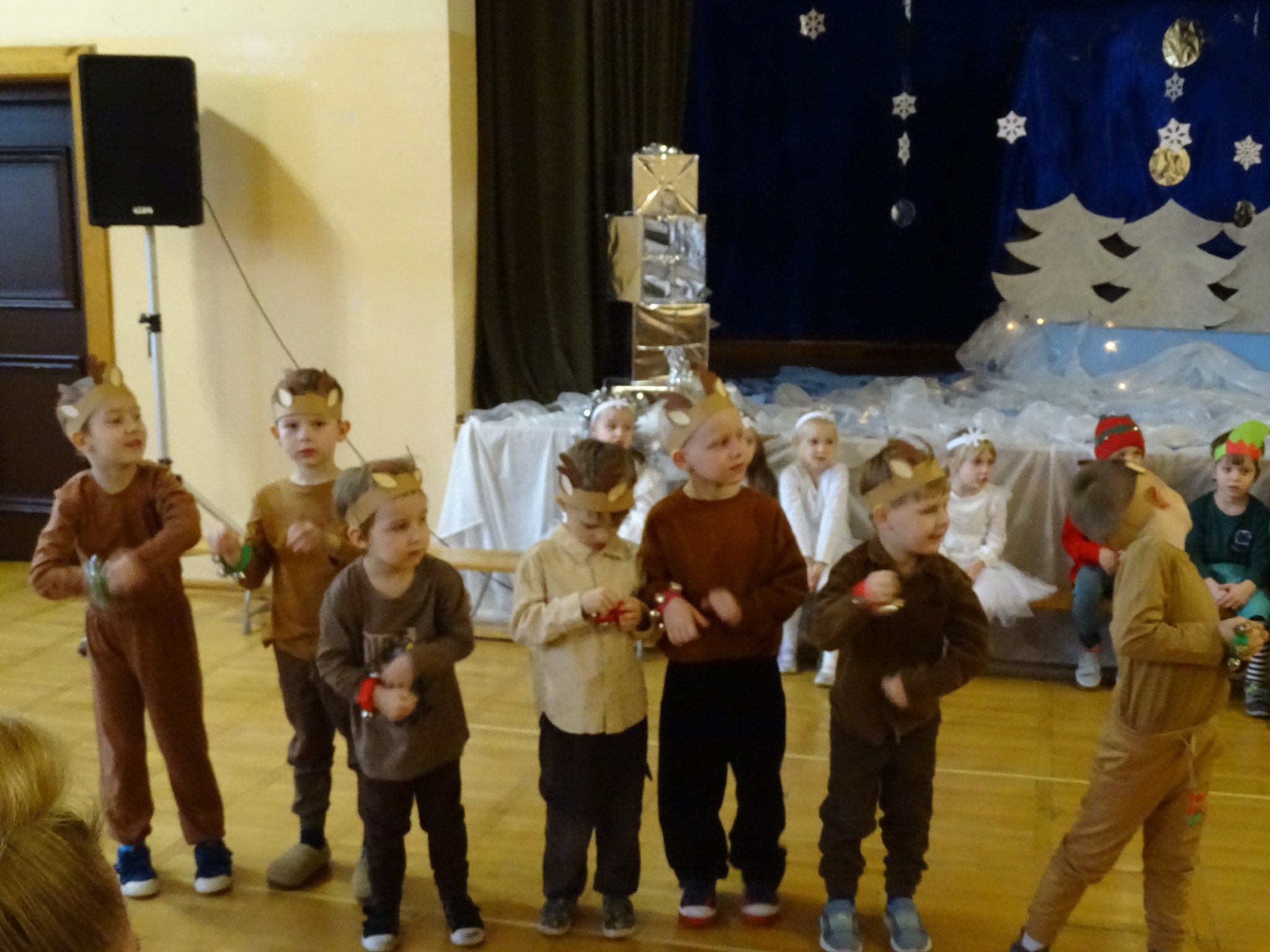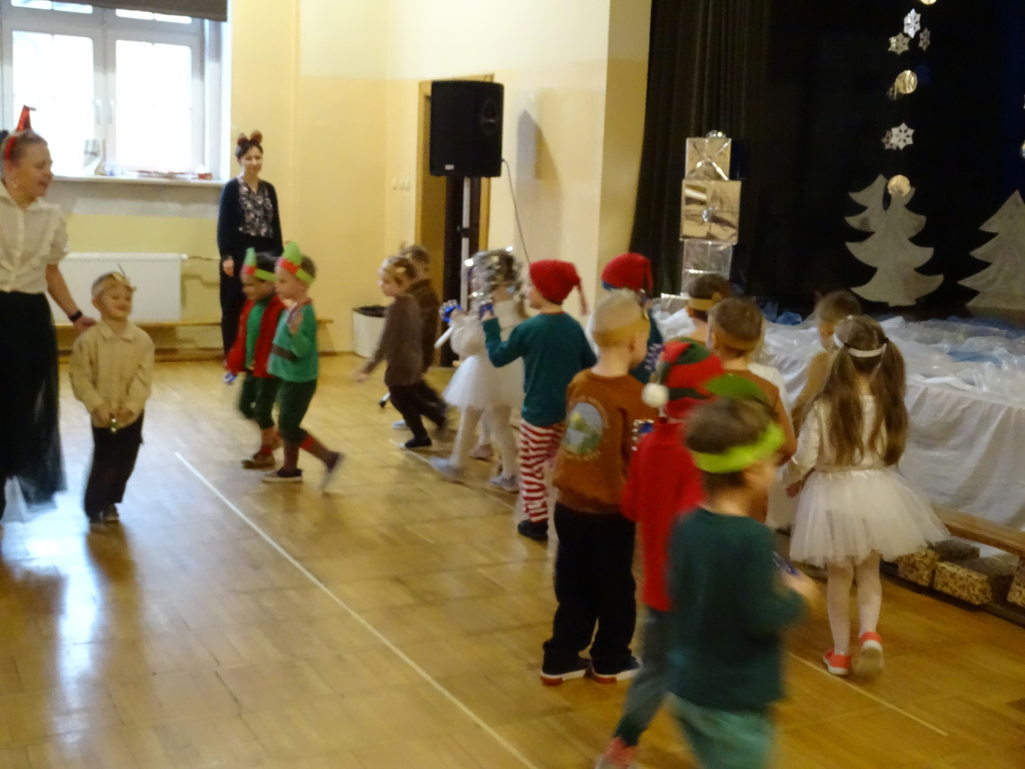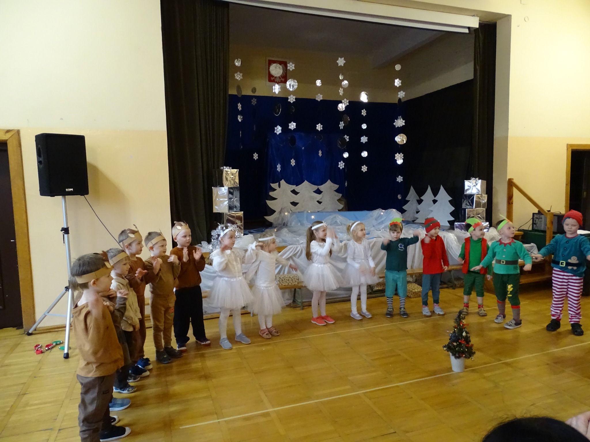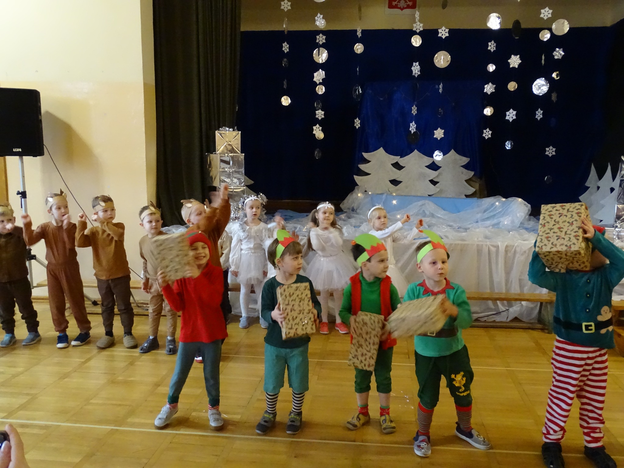 Na biegunie północnym, pośród polarnej nocy, gdzie śniegu jest po kolana żyje stado reniferów, elfów zgraja roześmiana i Mikołaj zwany świętym. Wiewiórki przeniosły zgromadzonych gości do tej pięknej krainy życząc wesołych świąt.