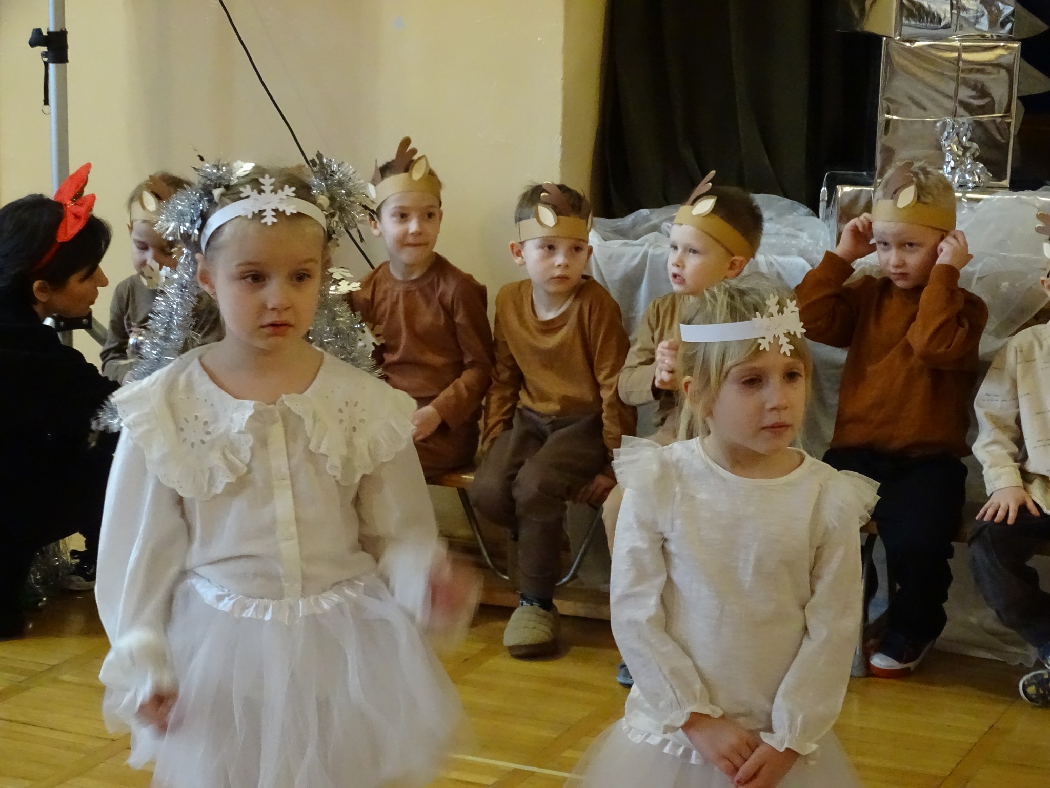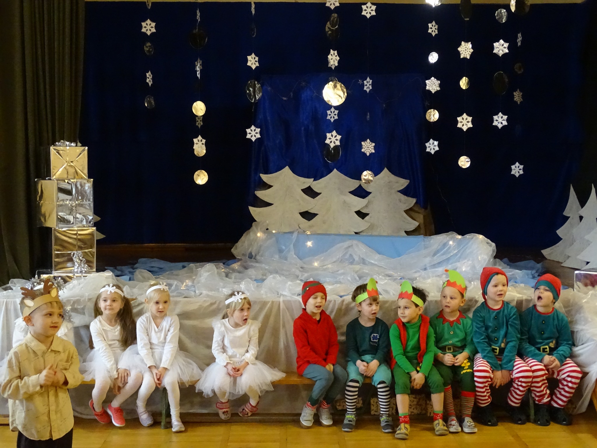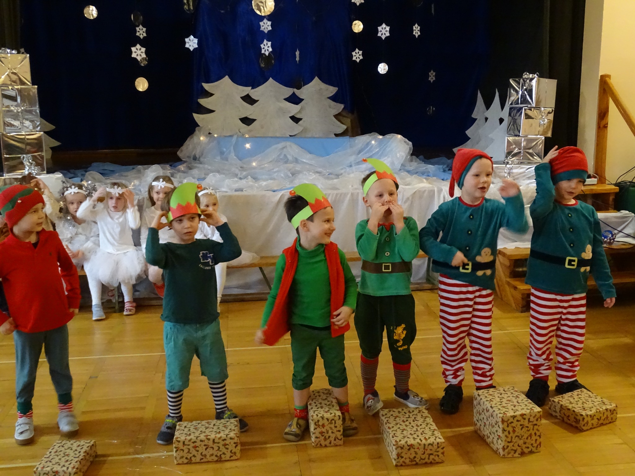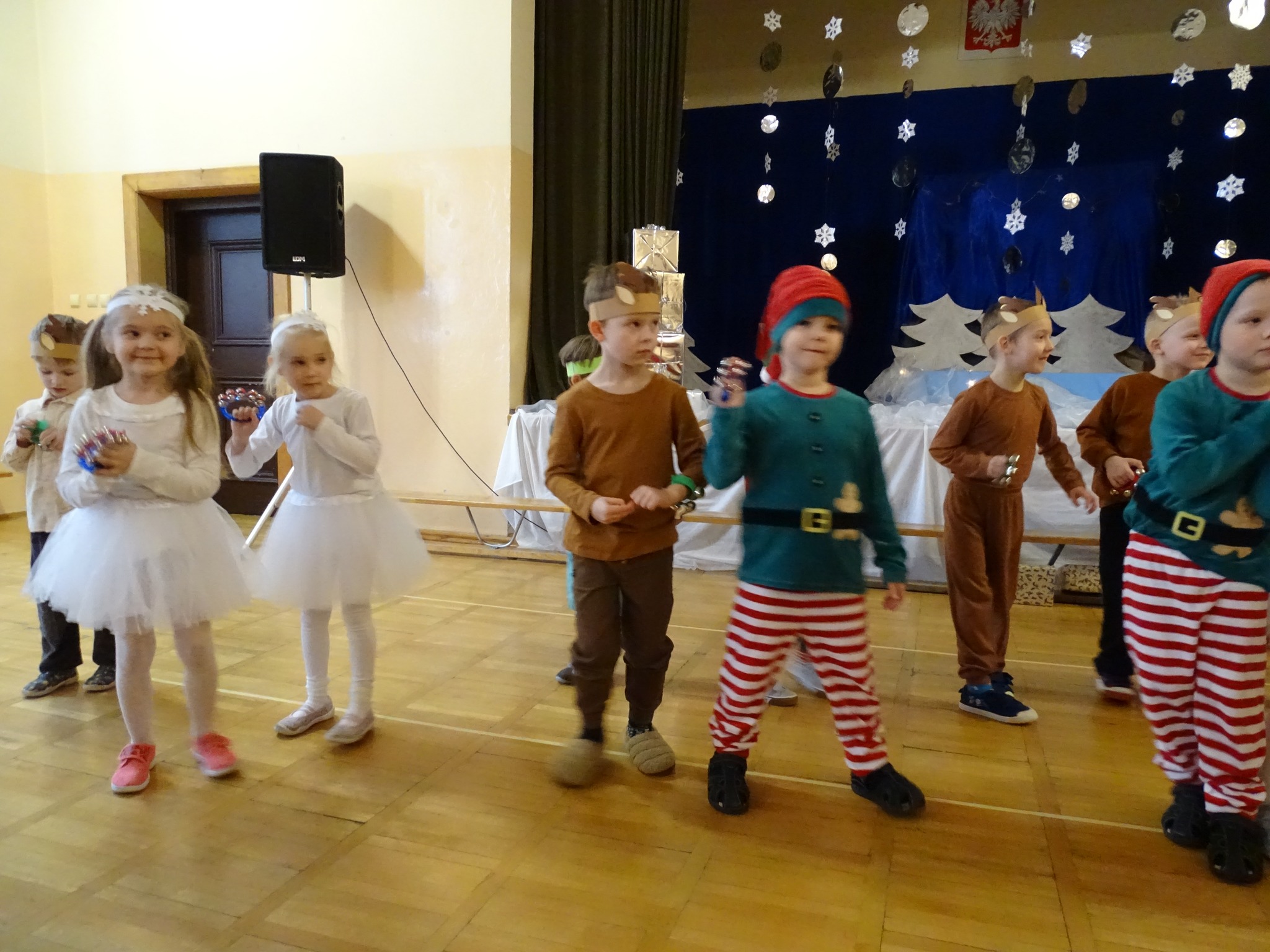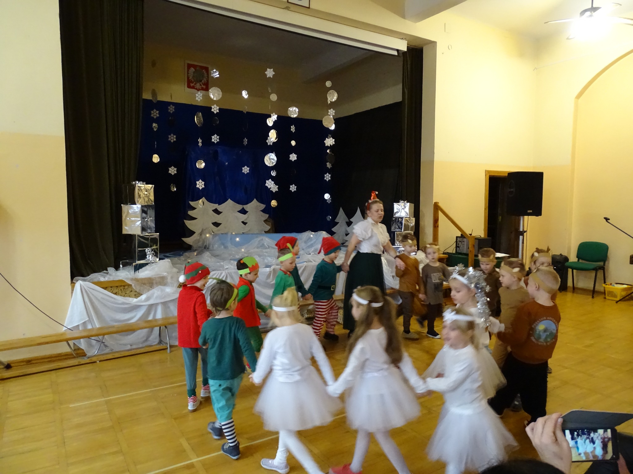 Na biegunie północnym, pośród polarnej nocy, gdzie śniegu jest po kolana żyje stado reniferów, elfów zgraja roześmiana i Mikołaj zwany świętym. Wiewiórki przeniosły zgromadzonych gości do tej pięknej krainy życząc wesołych świąt.