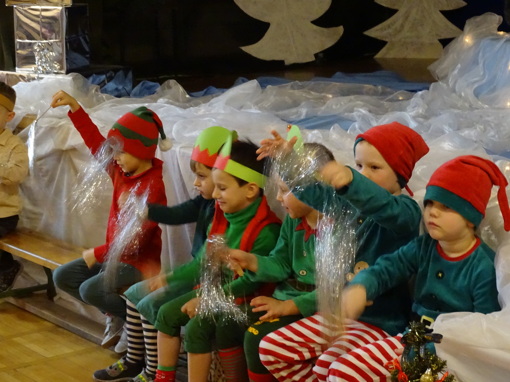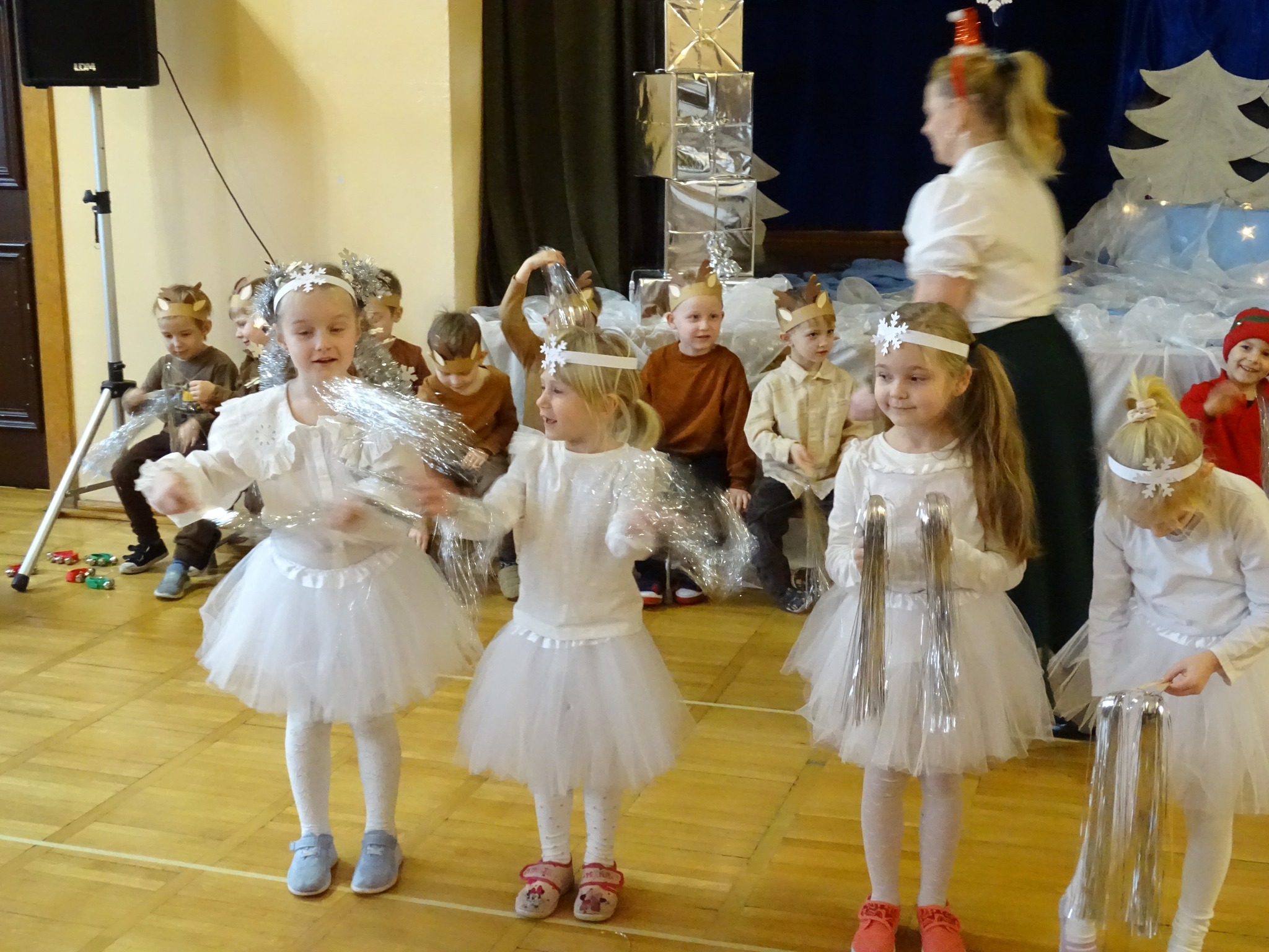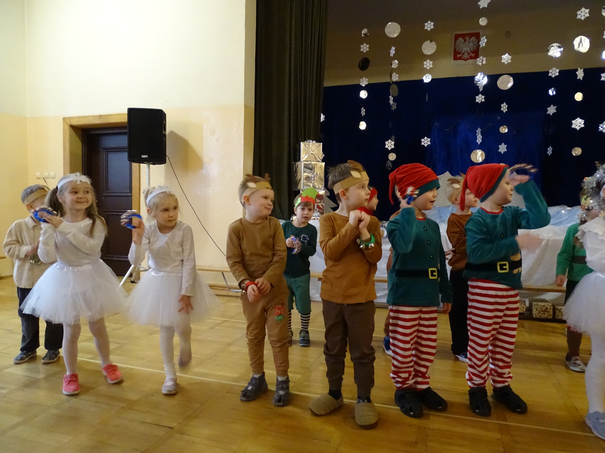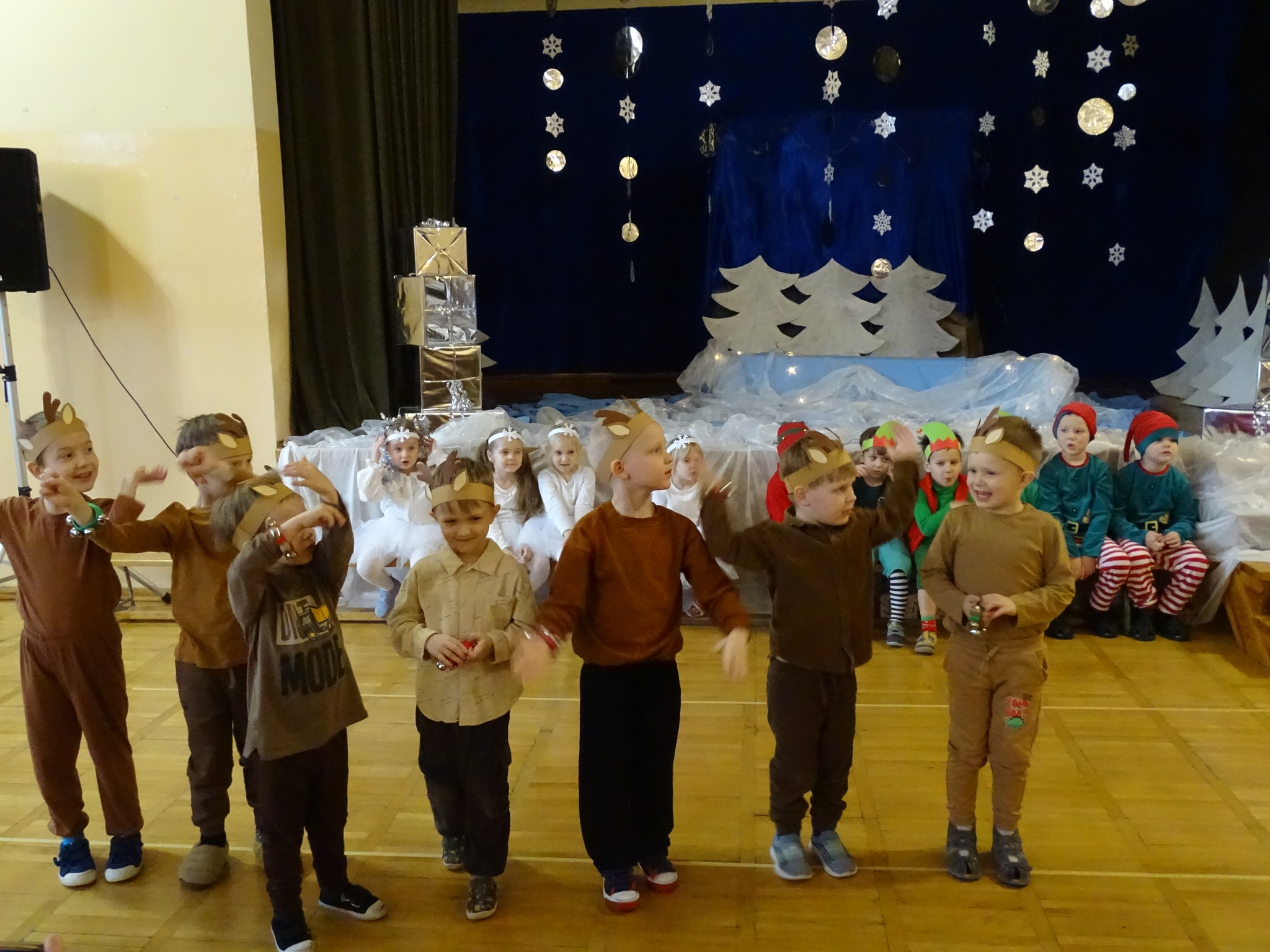 Na biegunie północnym, pośród polarnej nocy, gdzie śniegu jest po kolana żyje stado reniferów, elfów zgraja roześmiana i Mikołaj zwany świętym. Wiewiórki przeniosły zgromadzonych gości do tej pięknej krainy życząc wesołych świąt.