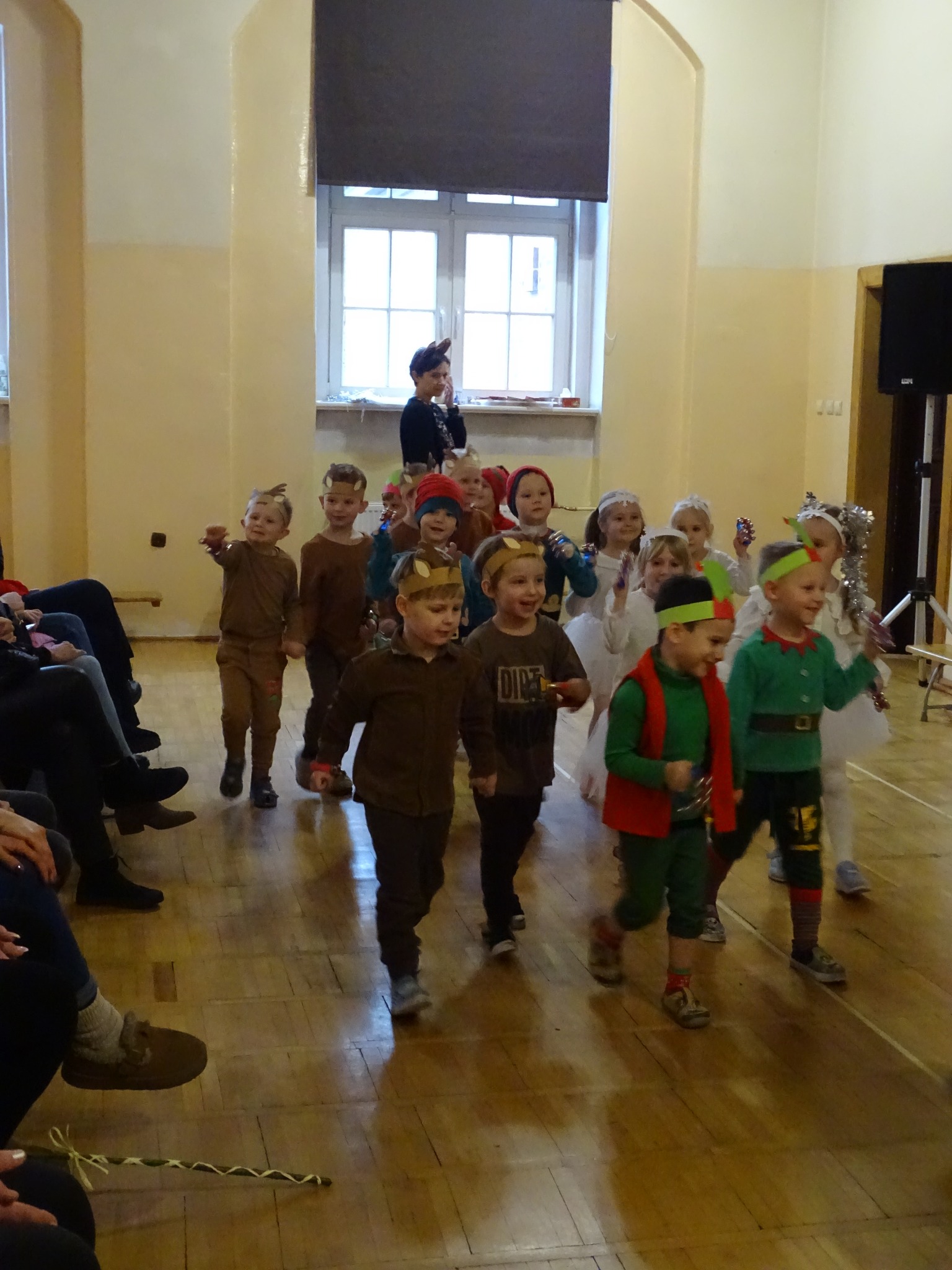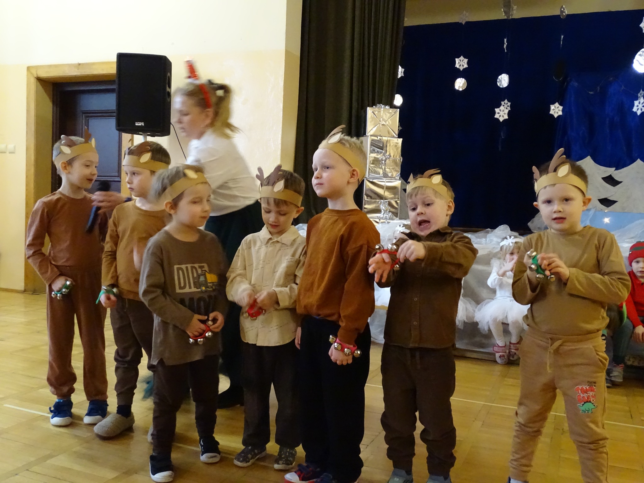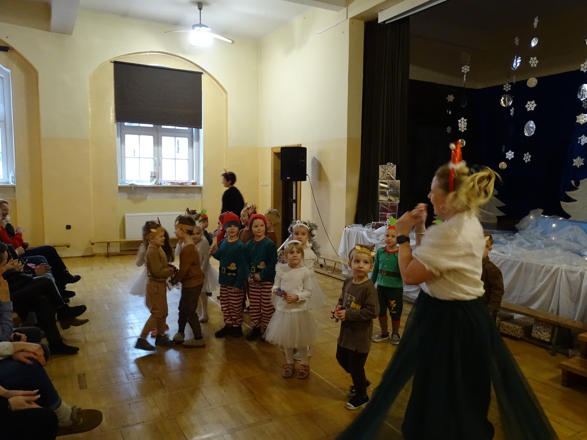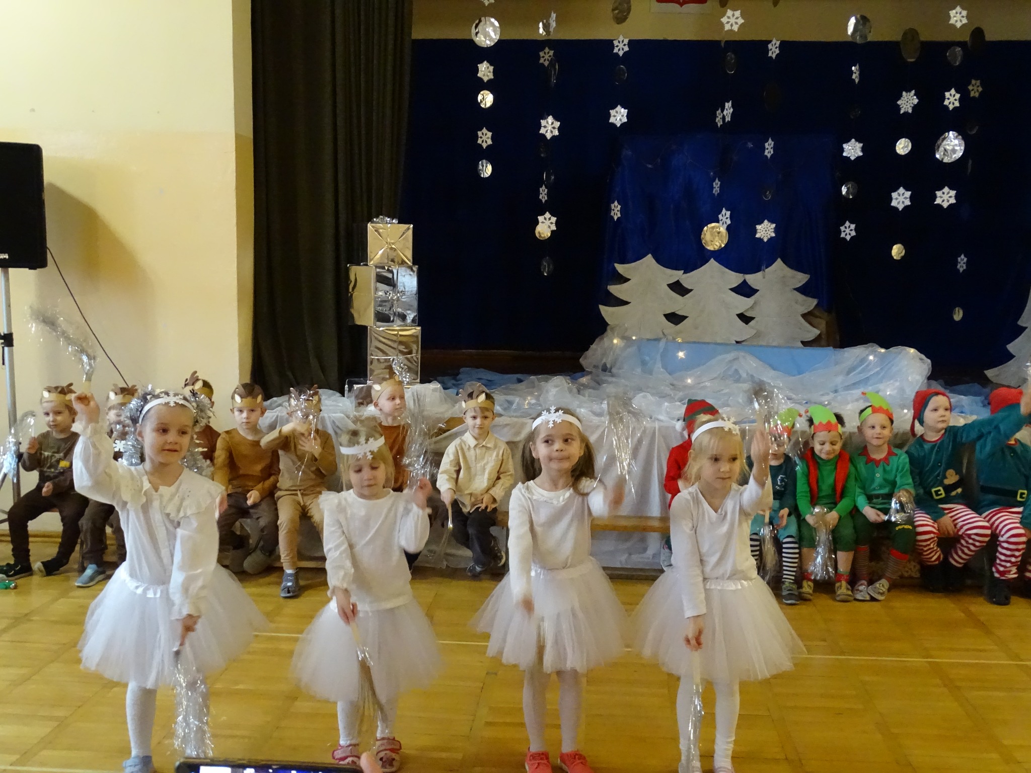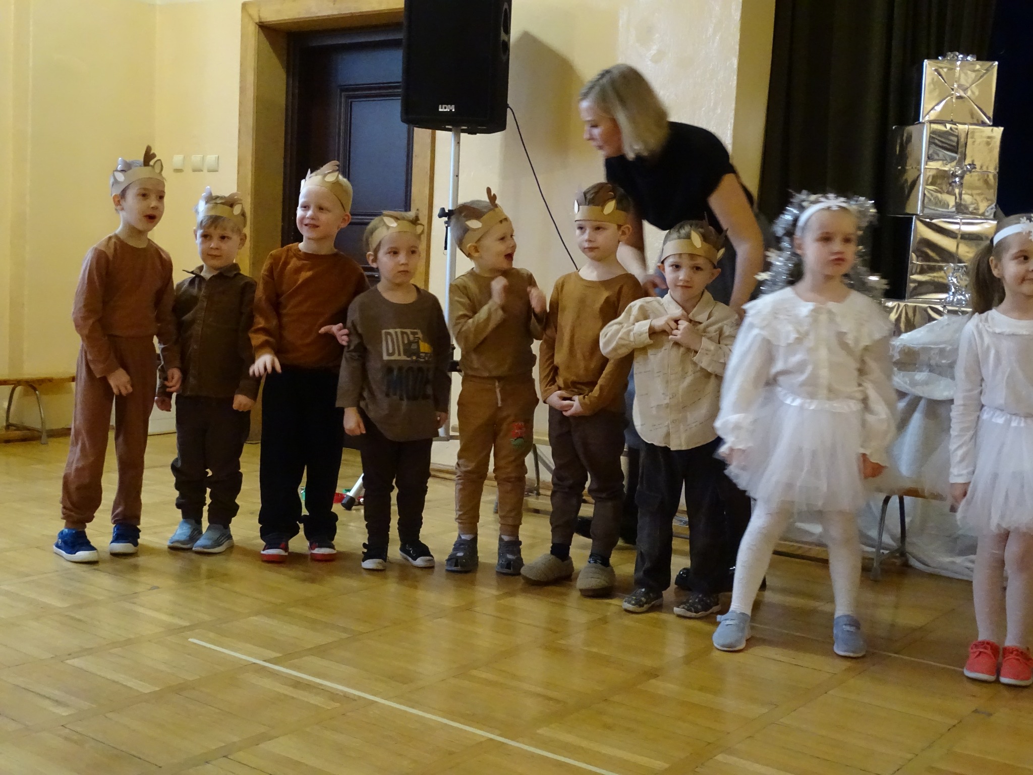 Na biegunie północnym, pośród polarnej nocy, gdzie śniegu jest po kolana żyje stado reniferów, elfów zgraja roześmiana i Mikołaj zwany świętym. Wiewiórki przeniosły zgromadzonych gości do tej pięknej krainy życząc wesołych świąt.